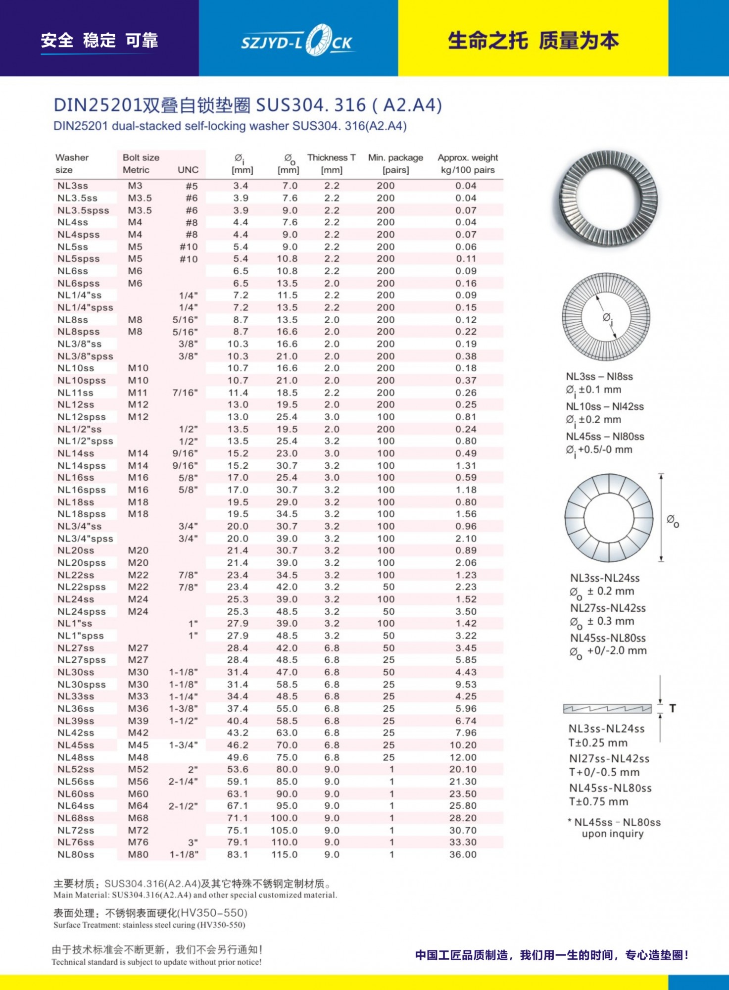 制造工藝:DIN25201標準墊圈全部使用SUS304.316或相應等級的A2.A4不銹鋼材質、經硬化處理后表面硬在HV350-520之間、硬化層度為20MU、硬度等級10級!墊圈的可適用于800度高溫及-160度低溫環境!