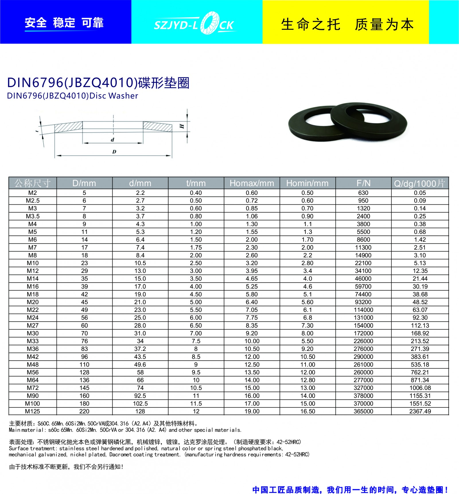 制造執(zhí)行標(biāo)準(zhǔn):符合DIN6796標(biāo)準(zhǔn)。規(guī)格:M2-M125型號(hào),也可提供訂制服務(wù)主要材質(zhì)有S60C,60Si2mn,51crav4及特殊合金材質(zhì),鹽浴硬化,表面處理為磷化黑,機(jī)械鋅,達(dá)克羅涂層等!不提供化學(xué)電鍍處理!多數(shù)情況下標(biāo)準(zhǔn)型碟形彈簧墊圈并不能完全滿足用戶要求,通過計(jì)算與適當(dāng)調(diào)整來獲得理想的訂制功能!