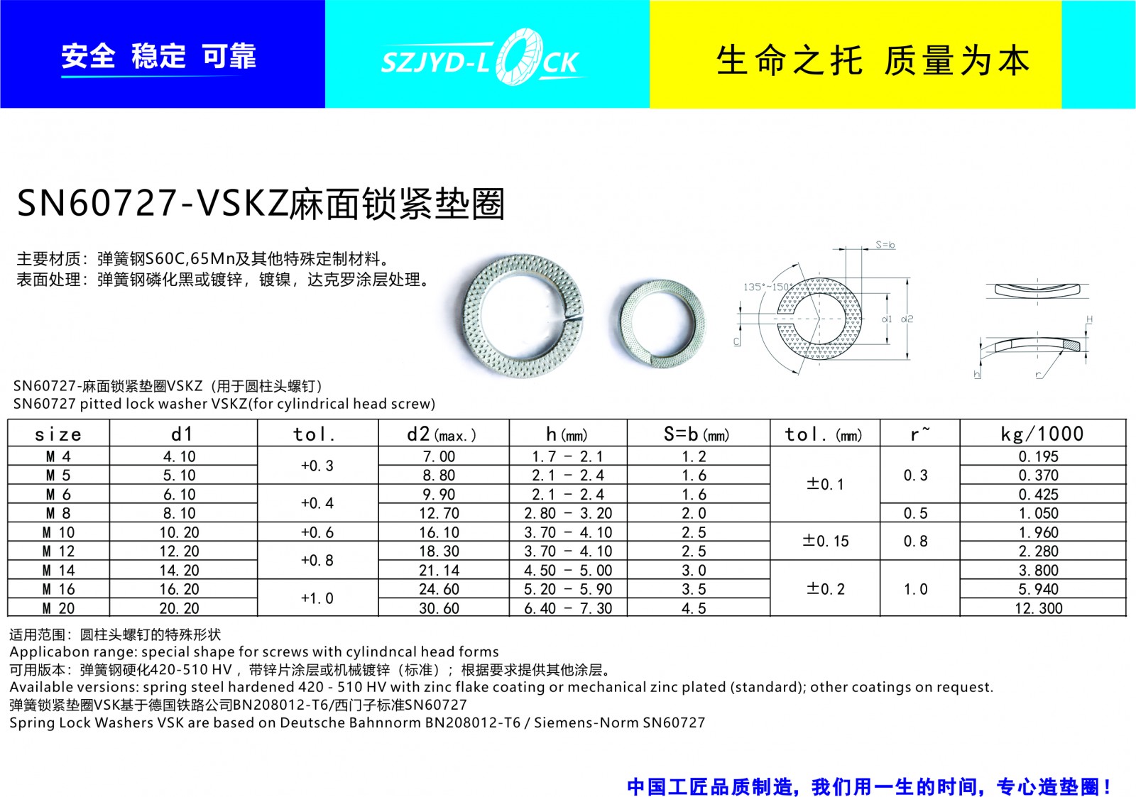 SN60727-VSKZ 麻面墊圈由西門(mén)子軌道交通公司設(shè)計(jì)制定、基于張力摩擦的構(gòu)造原理。鞍形墊圈表面麻面花紋與螺栓鎖緊面接觸,增大的鎖緊力起到了明顯防松功能!VSKZ標(biāo)準(zhǔn)窄型麻面墊圈適用于較小安裝空間!