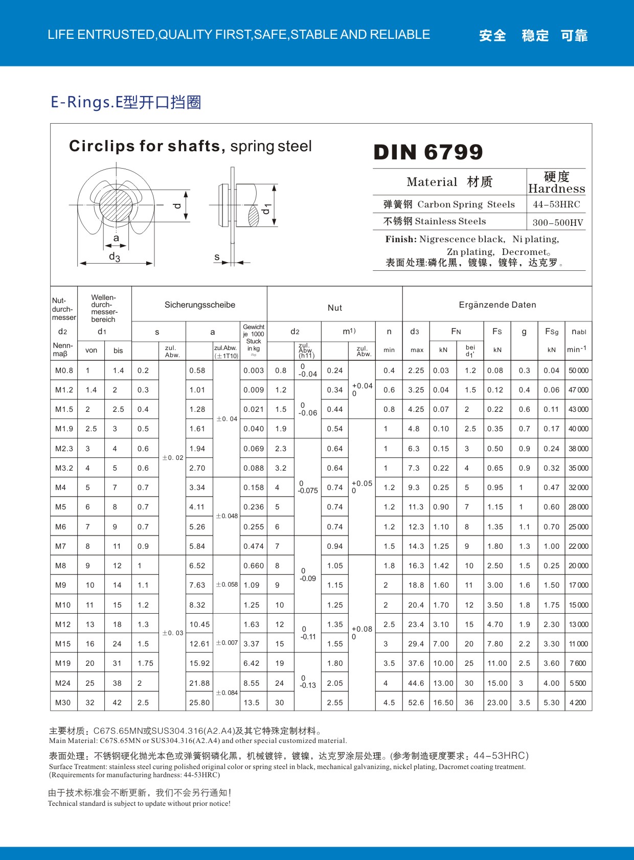 德國標準DIN6799開口擋圈,使用65MN,C67S彈簧鋼材質(zhì)及SUS304.SUS316/EN1.4301.EN1.4401不銹鋼材質(zhì),硬化質(zhì)量穩(wěn)定,回彈性好!彈簧鋼表面磷化黑,機械鋅等!鹽霧可達500H以上,保證無氫脆斷裂!瑞士模具制造設(shè)備,可生產(chǎn)0.8微精密開口擋圈,史特牢公司級進模具生產(chǎn)高效率低成本!