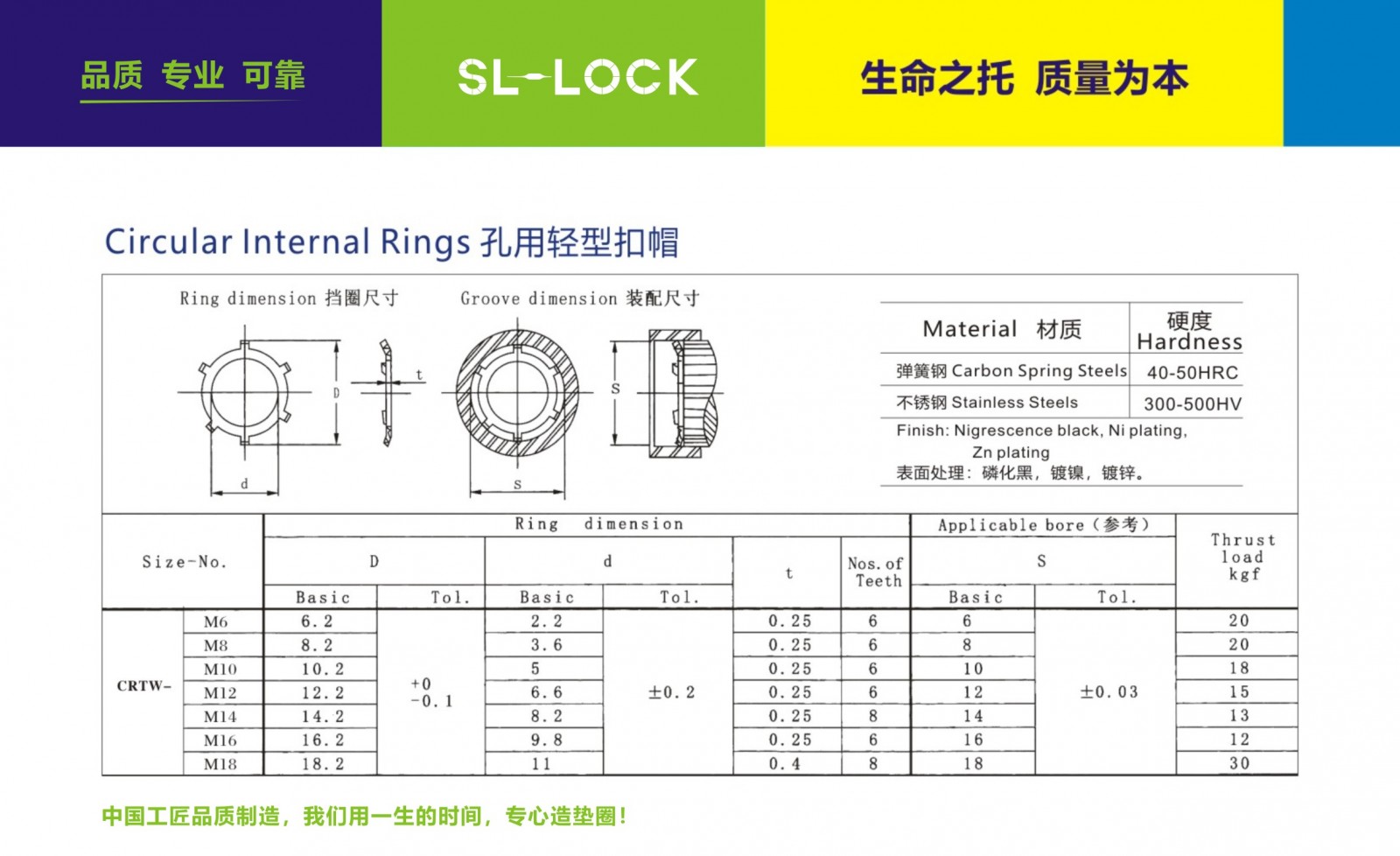 名稱:輕型孔用止動墊圈 執行標準:CRTW 型號:M6-M18 材質:SUS301/SUS304/SUS316 表面處理:硬化拋光