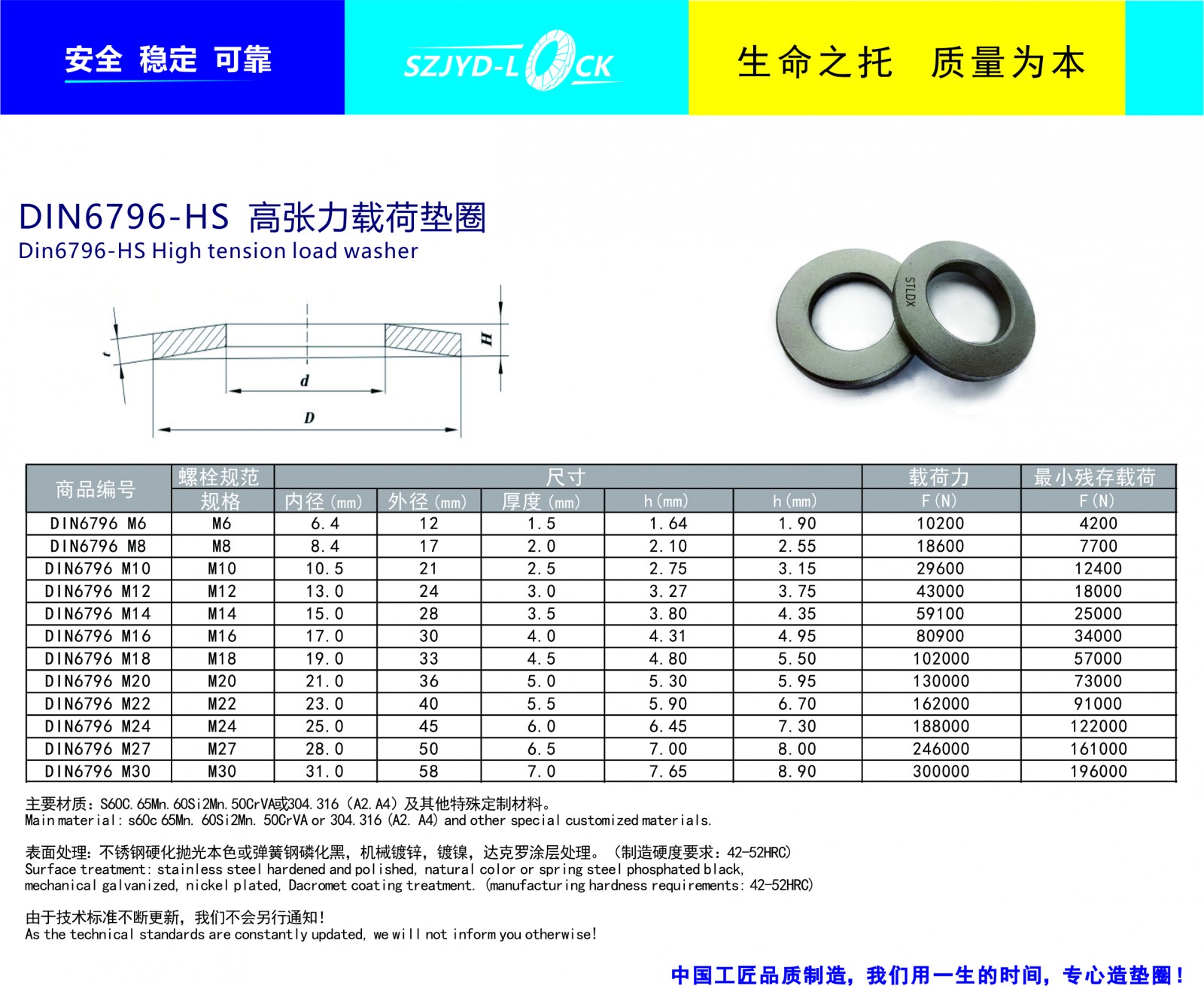 制造執(zhí)行標準:符合DIN6796-HS標準。規(guī)格:M6-M30型號,也可提供訂制服務主要材質(zhì)有S60C,60Si2mn,51crav4及SUS304\SUS316特殊合金等,經(jīng)等溫精細硬后進行磷化黑,機械鋅,鋅鋁涂層表面處理等!安全墊圈不適宜化學表面處理!多數(shù)標準型碟形彈簧墊圈有時并不能完全滿足設(shè)計要求,通過計算與調(diào)整訂制來獲得理想安全功能!